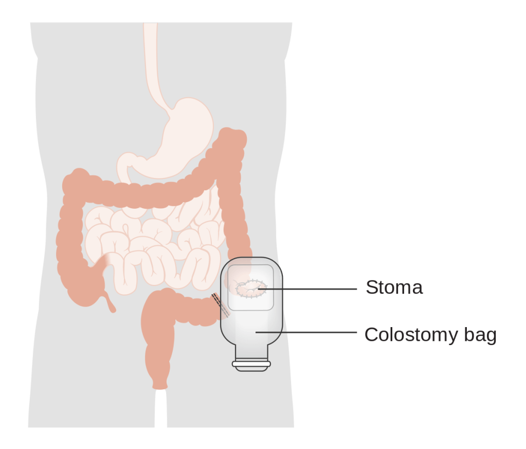 An artificial opening on the body to alleviate disease or discomfort is known as a stoma. In a general sense, a stoma is an opening in the abdomen to allow waste materials to leave the body. The organ sticking out on the abdomen to form an opening is the end of the small or large bowel.